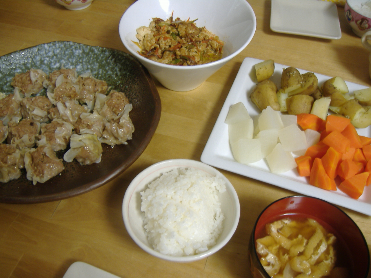 「野菜の蒸し物・いり豆腐・しゅうまい・こなすのお漬物・お味噌汁・ごはん」